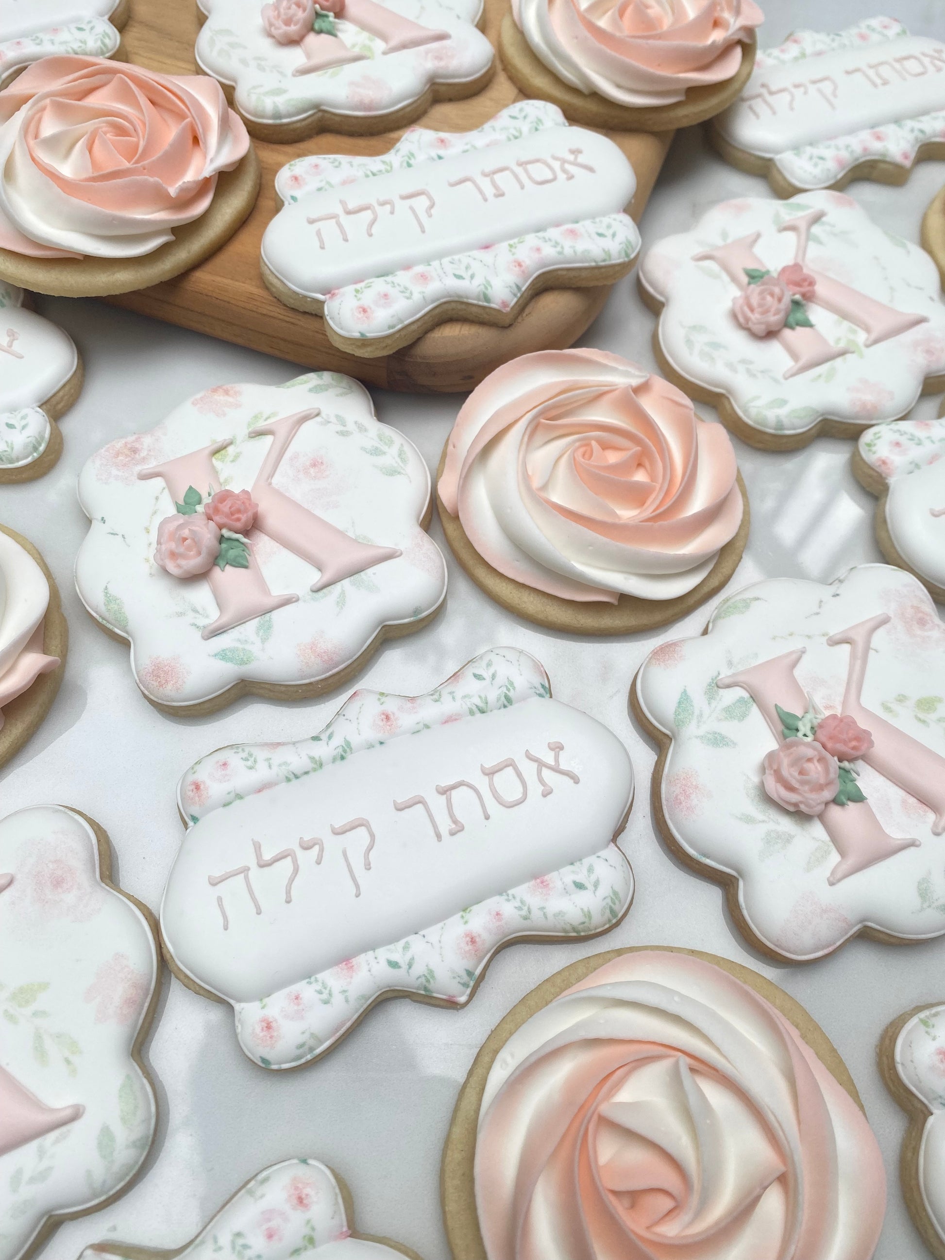 8 initial cookie with print and piped rose details