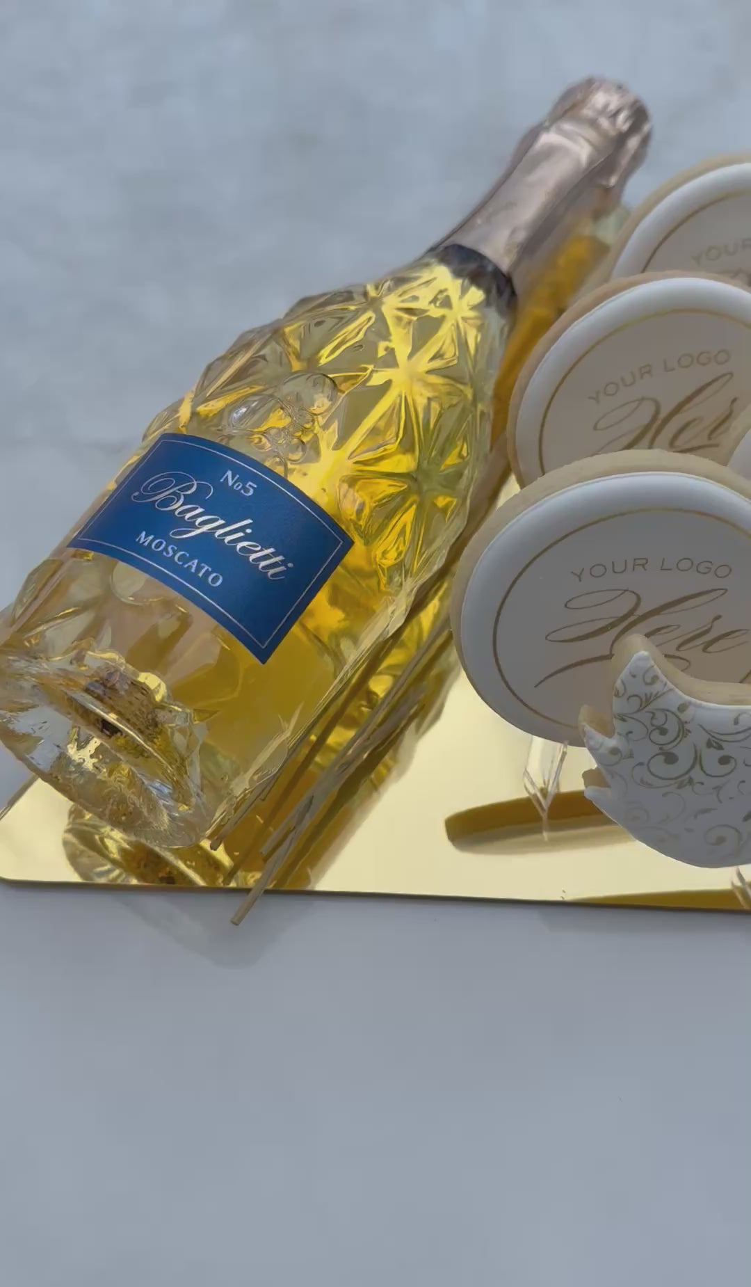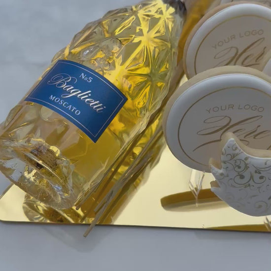 The Platinum Purim Box is our most luxurious Purim gift, featuring a Baglietti bottle, five custom logo cookies, and a signature Purim Sameach mask cookie, all presented on a stunning gold mirror triangle. A refined statement piece for premium corporate and personal gifting.